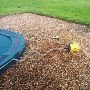 All you do here is to use a simple surface drainage pump to pump water out of the trampoline as and when you need to e.g. when the hole fills up with water after heavy rain. You take a temporary electrical supply to the pump (just use an extension cable from the nearest power point) , connect to the pump, put the inflow hose into the trampoline hole and take the outflow hose to another area in the garden and switch on. The picture to the below shows this process.