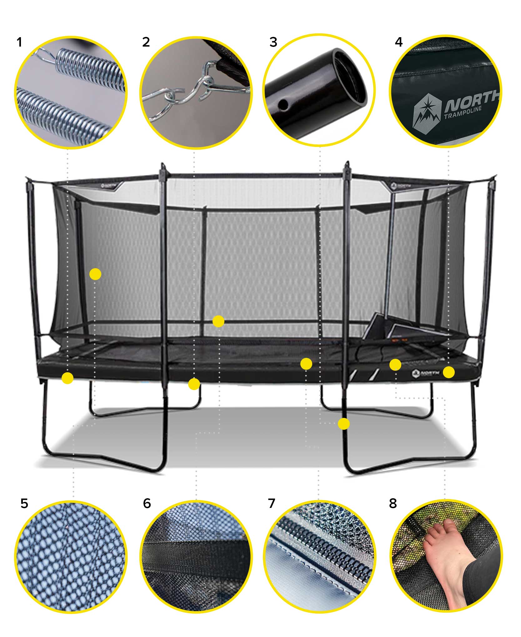 - 6. Reinforced safety belt on net guides bouncers back to the safe jumping area